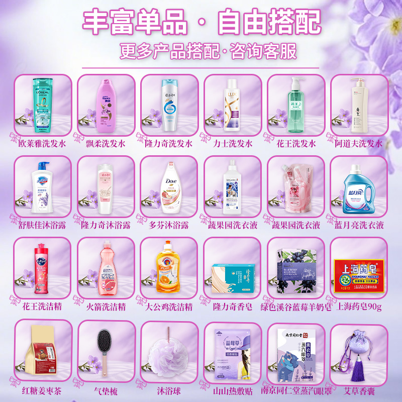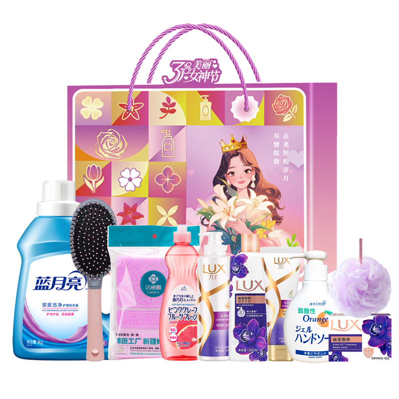 禮盒尺寸:34*8.5*27cm 包裝尺寸:69*37.5*56.5CM 產(chǎn)品配置:(香型隨機) 力士洗發(fā)水400ml 力士沐浴露350ml 力士護發(fā)素160g 力士香皂105g 藍月亮洗衣液1kg 潔麗雅毛巾69*33cm 火箭洗潔精600ml animo洗手液200ml 順發(fā)氣墊梳 沐浴球 精美禮盒