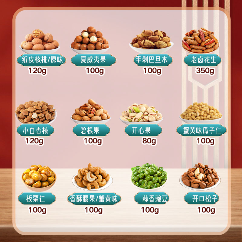 內容物:開心果/80g 碧根果/100g 開口松子/100g 夏威夷果/100g 手剝巴旦木/100g 香酥腰果/蟹黃味/100g 小白杏核/120g 紙皮核桃/120g 板栗仁/100g 老鹵花生350g 蟹黃味瓜子仁/100g 蒜香豌豆/100g 禮盒尺寸:41*29*18cm 品類豐富,產品便攜包裝 購物不止于下單,服務長期保持 性價比極高,各價位都有,滿足不同選擇