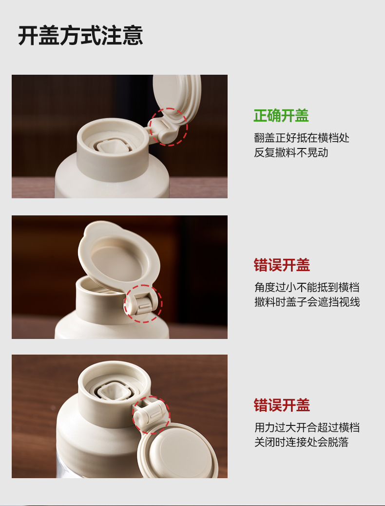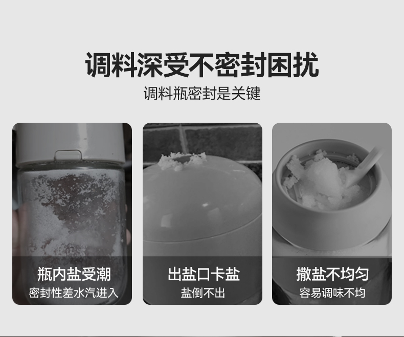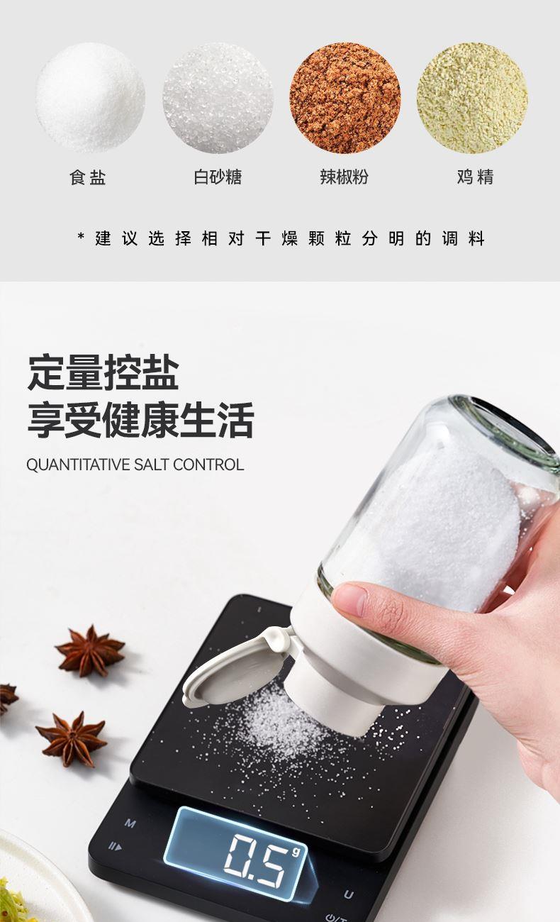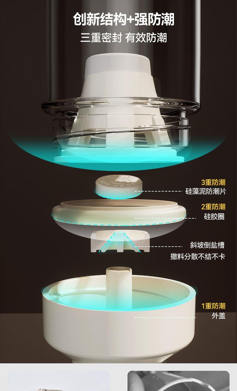 均勻定量撒鹽,3重密封不結塊 創新結構+強防潮,三重密封 有效防潮 直角導流倉撒鹽更均勻,防潮升級內置干燥塊 一體式翻蓋再不擔心亂丟,密封更牢 蓋子不怕丟 不止裝鹽多調料可裝,定量控鹽享受健康生活