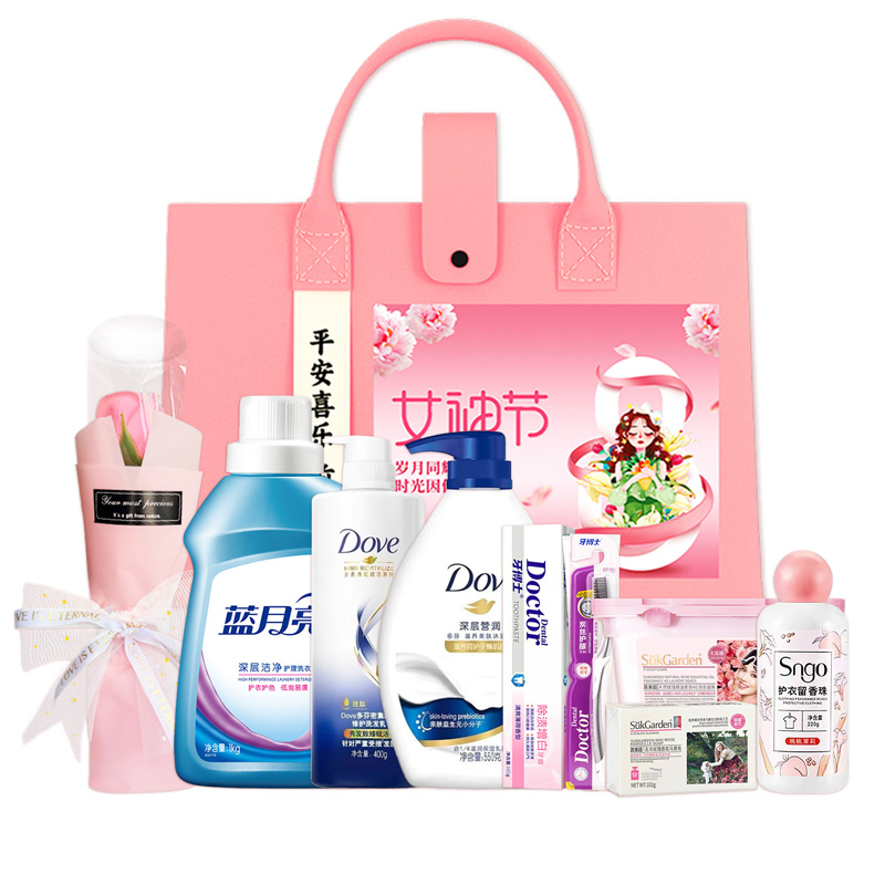 毛氈包尺寸:23*33.5*9.5cm 包裝尺寸:69* 46.5*29 CM 產品配置:(香型隨機) 永生香皂花束 多芬洗發水400ml 多芬沐浴露550ml 藍月亮洗衣液1kg 牙博士牙膏105g 牙博士炭絲護齦牙刷 蔬果園馬賽皂101g 蔬果園洗衣凝珠10g*6顆 SNGO護衣留香珠220g 毛氈包