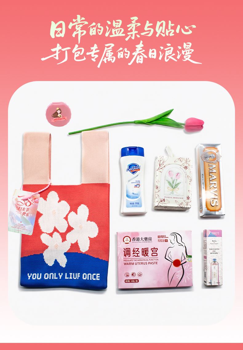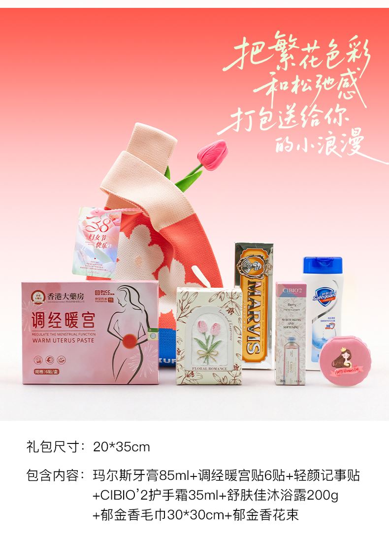 禮包尺寸:20*35cm 瑪爾斯牙膏:85ml 調經暖宮貼:6貼 輕顏記事貼 CIBIO'2護手霜:35ml 舒膚佳沐浴露:200g 郁金香毛巾:30*30cm 郁金香花束