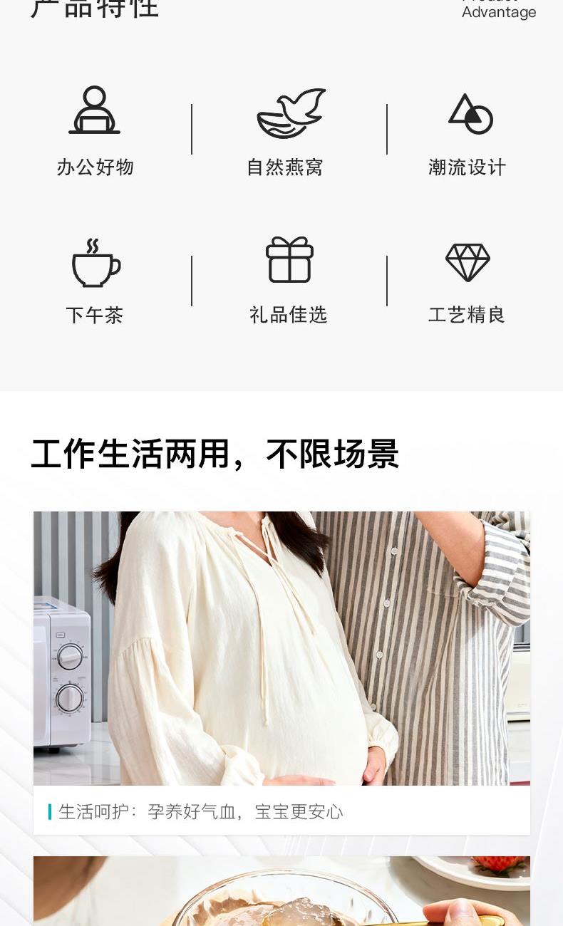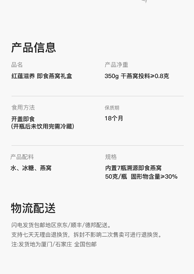 配置:50g*7瓶/盒 固形物含量≥30%/瓶 干燕窩投料≥0.8克/瓶 配料表:水、冰糖、燕窩 食用方法:開(kāi)蓋即食 (開(kāi)瓶后未飲用完需冷藏保存) 凈含量:350克/盒 保質(zhì)期:18個(gè)月 儲(chǔ)存方法:存放于通風(fēng)干燥處